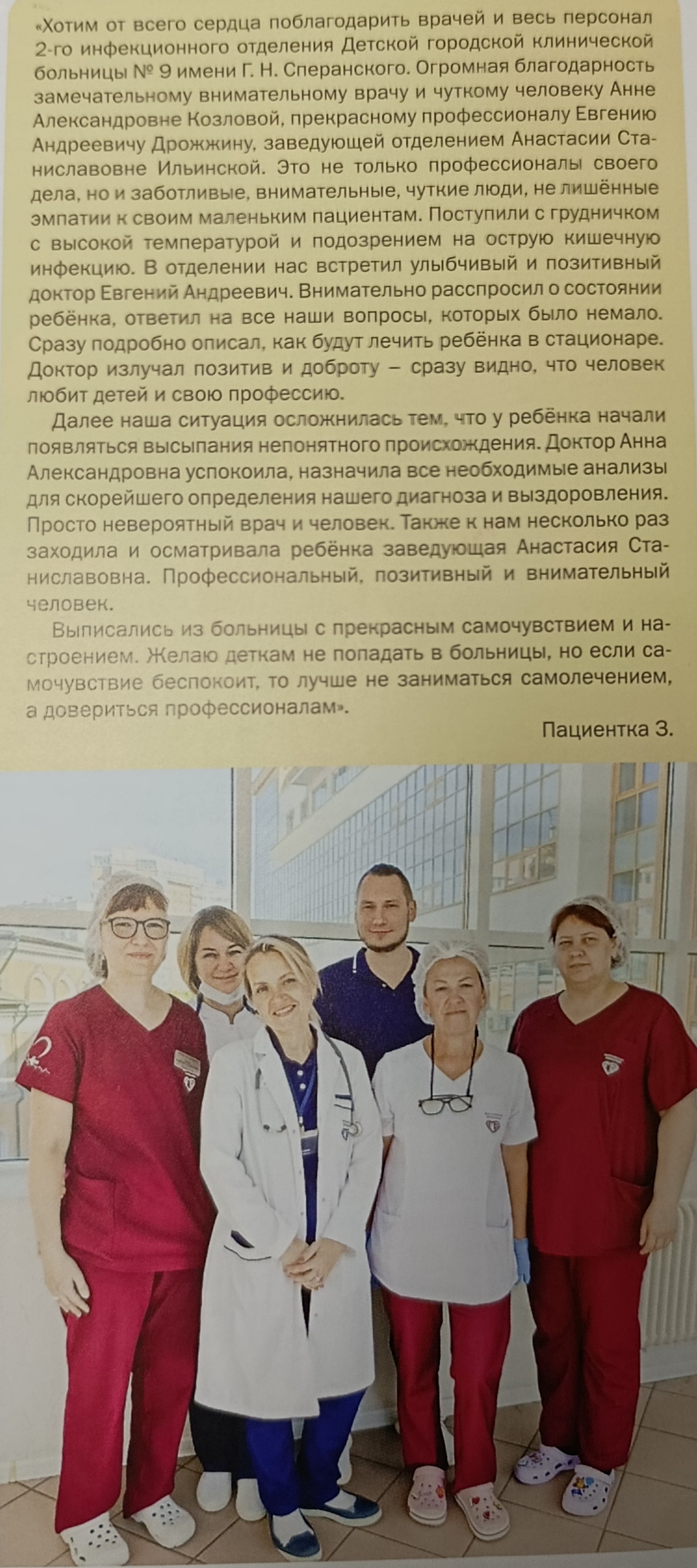 «Хотим от всего сердца поблагодарить врачей и весь персонал 2-го инфекционного отделения Детской городской клинической больницы № 9 имени Г. Н. Сперанского. Огромная благодарность замечательному внимательному врачу и чуткому человеку Анне Александровне Козловой, прекрасному профессионалу Евгению Андреевичу Дрожжину, заведующей отделением Анастасии Станиславовне Ильинской. Это не только профессионалы своего дела, но и заботливые, внимательные, чуткие люди, не лишённые эмпатии к своим маленьким пациентам. Поступили с грудничком с высокой температурой и подозрением на острую кишечную инфекцию. В отделении нас встретил улыбчивый и позитивный доктор Евгений Андреевич. Внимательно расспросил о состоянии ребёнка, ответил на все наши вопросы, которых было немало. Сразу подробно описал, как будут лечить ребёнка в стационаре. Доктор излучал позитив и доброту – сразу видно, что человек любит детей и свою профессию.