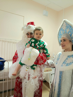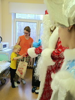 К ребятам, которые не смогли прийти, праздник пришел в палаты вместе с Дедушкой Морозом и Снегурочкой. Посланники Нового года передали детям подарки с добрыми пожеланиями скорейшего выздоровления!