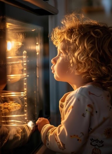 Также на кухне для детей опасна духовка. Нередко маленькие дети опираются ручками о горячую дверцу и получают контактный ожог.